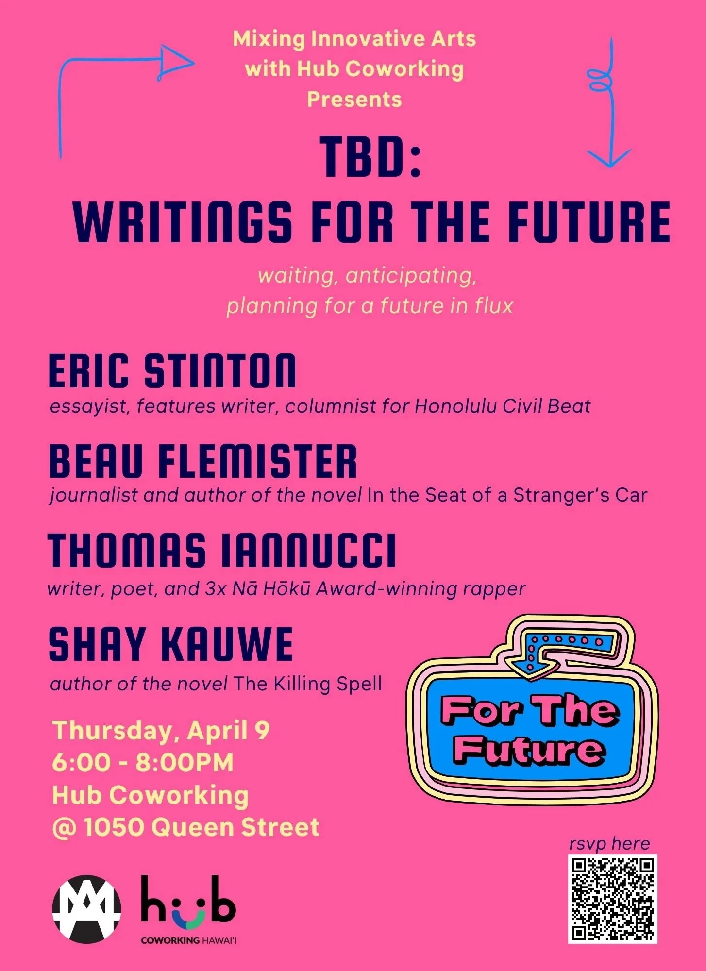 April 9: TBD: Writings for the Future ReadingK. KahakauwilaMarch 30, 2026Thomas Iannucci, Eric Stinton, Shay Kauwe, Beau Flemister Facebook0 Twitter 0 Likes